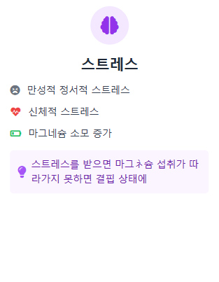 스트레스도 빼놓을 수 없습니다. 스트레스를 많이 받으면 소모되는 마그네슘 양이 늘어나는데, 섭취가 따라가지 못하면 만성 결핍 상태에 쉽게 빠지게 됩니다.