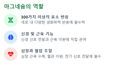 마그네슘 부족현상은 현대인에게 매우 흔한 영양 문제 중 하나입니다. 평소 특별한 질병이 없음에도 이유 없는 피로감, 잦은 근육 경련, 두통, 심장 두근거림 같은 증상이 반복된다면 마그네슘 부족현상을 의심해볼 필요가 있습니다. 마그네슘은 우리 몸에서 300가지 이상의 효소 반응에 관여하며, 신경과 근육, 심장, 혈압까지 폭넓게 관여하는 핵심 미네랄입니다. 그만큼 부족할 경우 나타나는 증상도 매우 다양하고 전신적으로 나타날 수 있습니다.