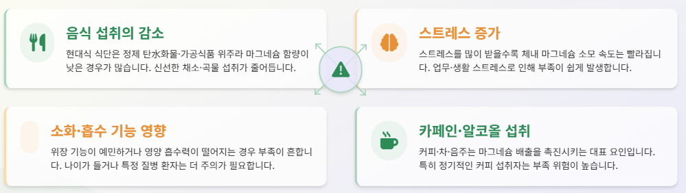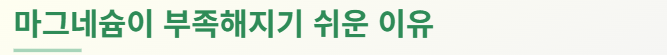 마그네슘이 중요한 만큼 부족해지기 쉬운 환경 요인도 많습니다.