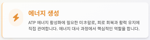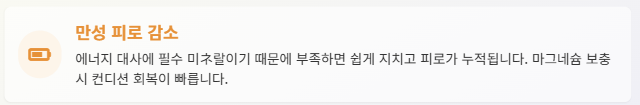 ATP 에너지 활성화에 필요한 미네랄로 피로 회복과 활력 유지에 직접 관여합니다.