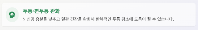 뇌신경 흥분을 낮추고 혈관 긴장을 완화해 반복적인 두통 감소에 도움이 될 수 있습니다.